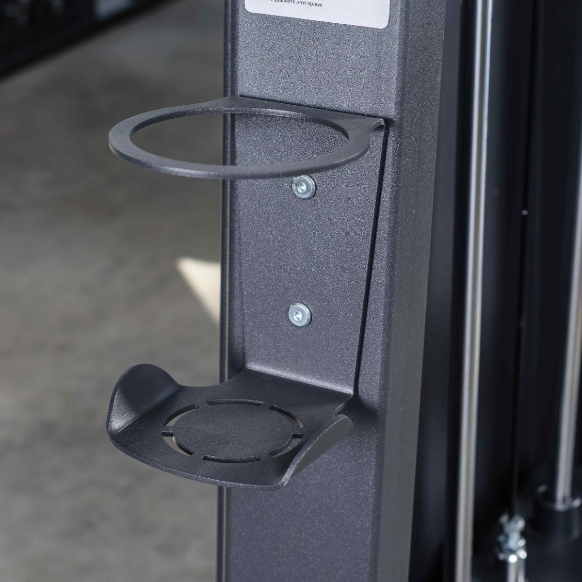 На раме тренажёра закреплён металлический держатель для бутылки или личных вещей.