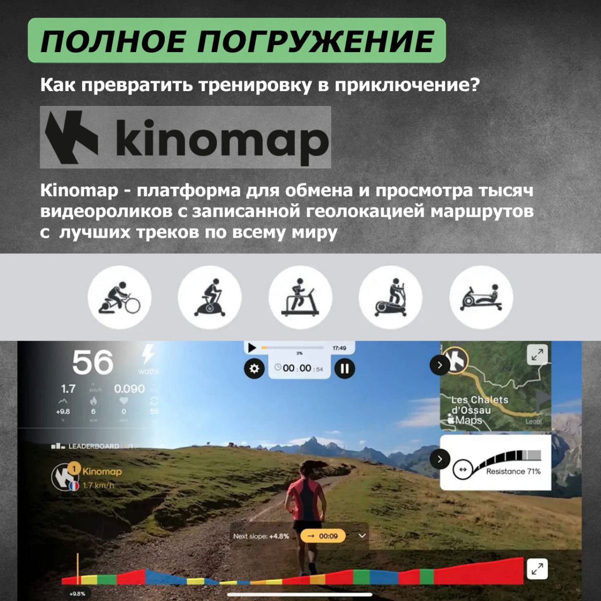 | Приложение Kinomap* | Платформа для обмена и просмотра тысяч видеороликов с записанной геолокацией маршрутов с лучших треков по всему миру (*особенности подключения уточняйте у менеджеров) |