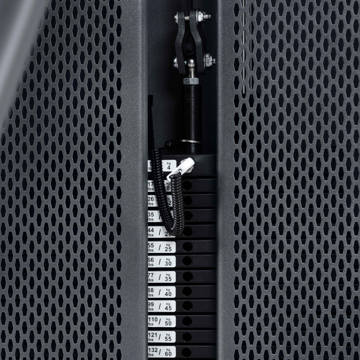 Металлическая перфорированная защита весового стека с лицевой стороны и сплошная защита с внешней стороны выполнена из листового металла толщиной 2 мм. Для повышения эксплуатационных параметров тренажера в восьми точках у основания установлены ребра жесткости, примыкающие к несущей раме через скрытое болтовое соединение сечением 6 мм.