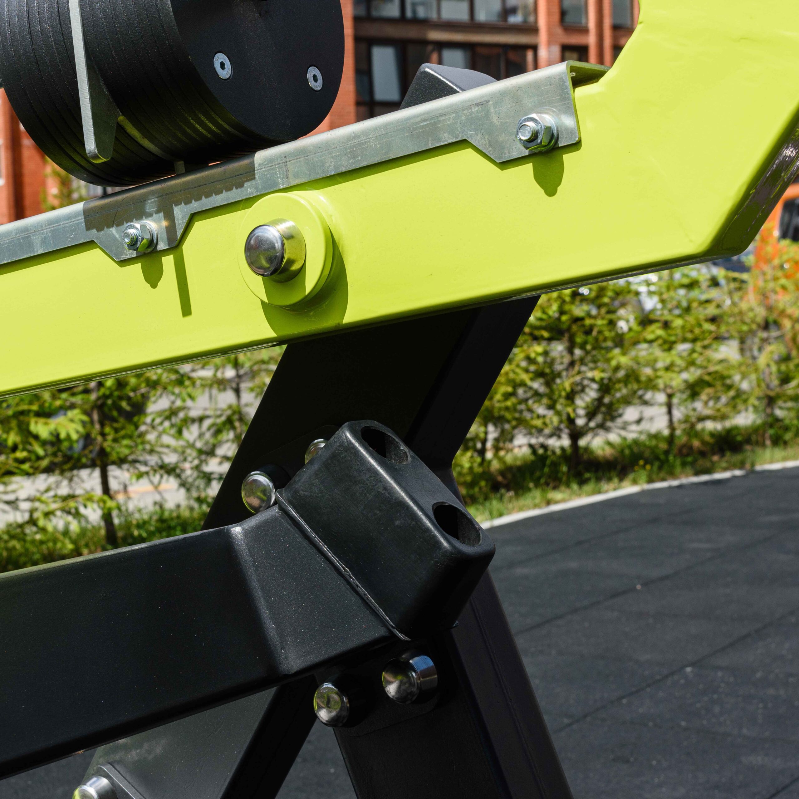 Надёжность и прочность разъёмных соединений конструктивных элементов тренажёра обеспечиваются за счёт использования высококачественного оцинкованного крепежа, выступающие части которого закрыты металлическими защитными колпачками.