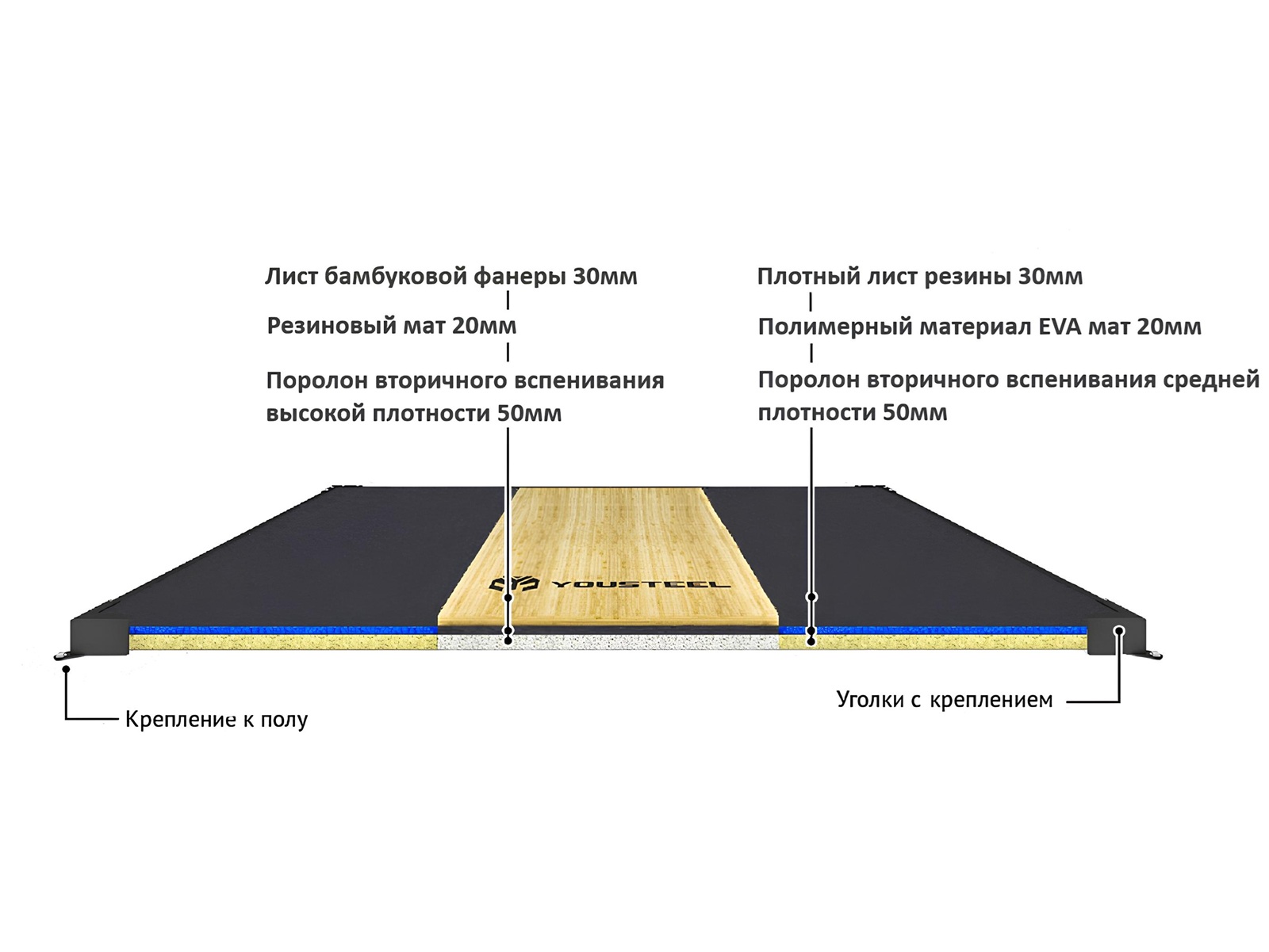 Виброгасящий помост YOUSTEEL разработан с целью уменьшения шума и ударной нагрузки в зоне силовой работы (пауэрлифтинг, тяжелая атлетика) вашего зала и снижения проблем связанных с передачей вибраций на конструкции здания.