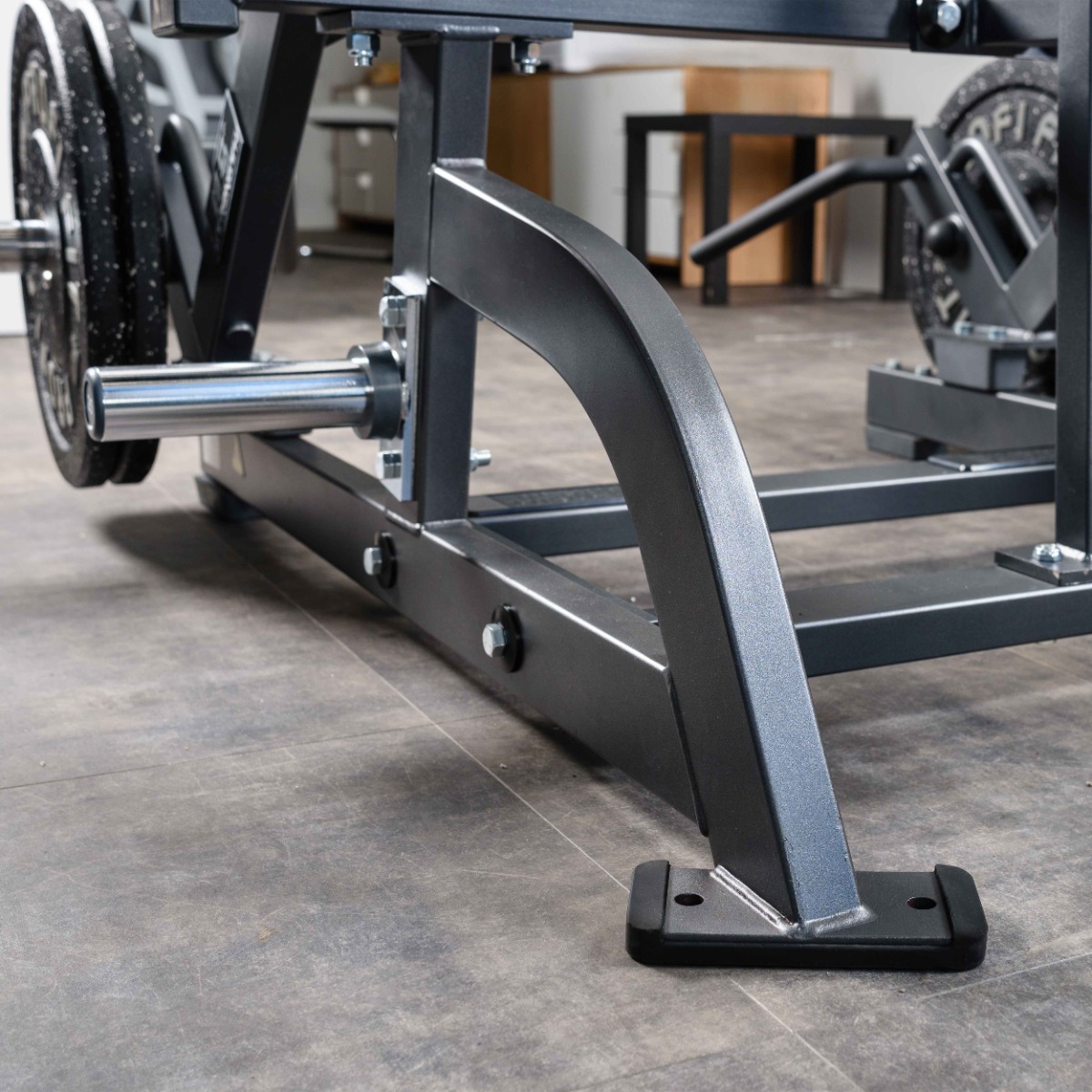 Тренажер имеет две опорные ножки из стального листа с отверстиями для крепления к полу и резиновыми накладками и две резиновые опорные ножки для достижения оптимальной высоты и устойчивости.