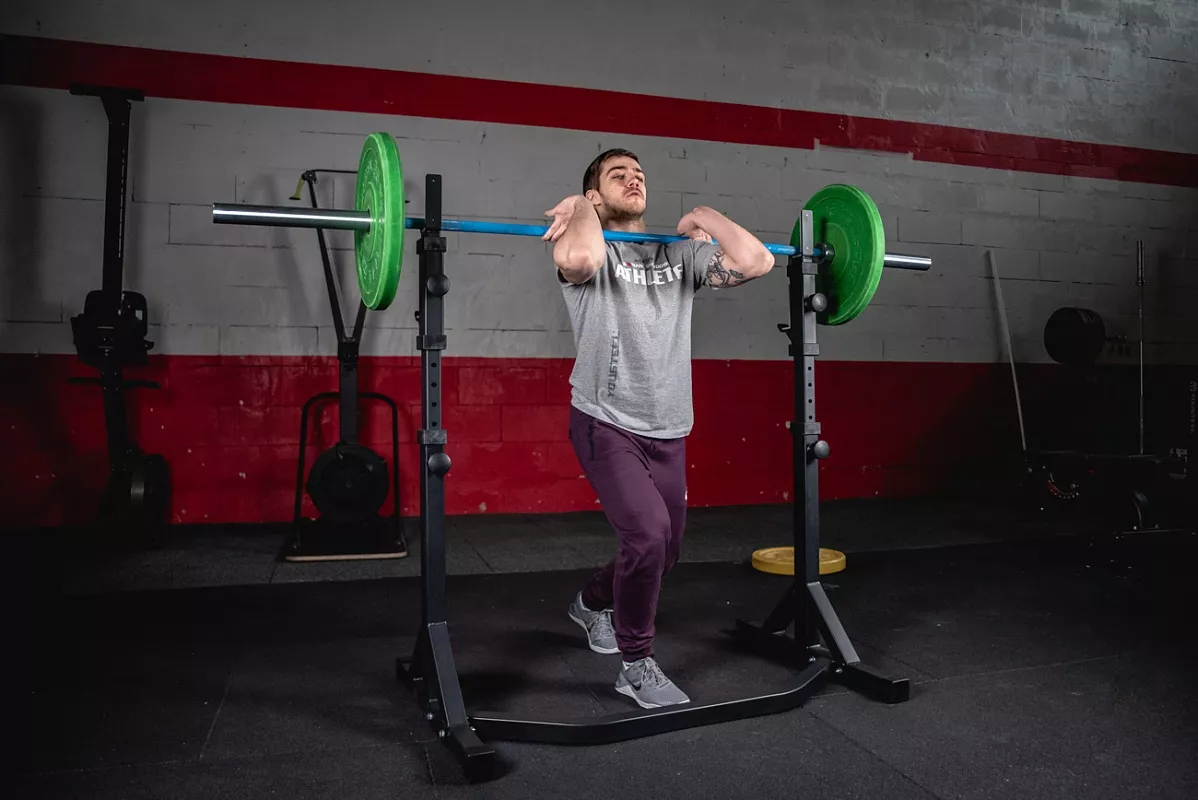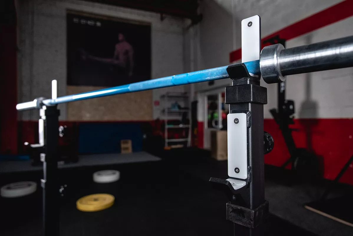 В этой версии стоек мы доработали конструкцию опоры, фиксирующие болты и изменили конструкцию нижней пары крюков, которые теперь по форме повторяют верхние. Благодаря этому выполнять жим лёжа стало гораздо удобней. Стойки стали жестче и устойчивее за счет того, что мы убрали механизм регулировки ширины. Теперь внутренняя ширина фиксированная – 1100мм. Механизм фиксации – болт с пружинным фиксатором. Во время тренировок с большими весами его можно закрутить, тем самым увеличив жёсткость фиксации. Но для ежедневных тренировок рядовых клиентов это не обязательно. На стойках 4 таких болта: 2 на регулировку высоты стоек и 2 на страховочные упоры. Верхние и нижние крюки покрыты пластиком, для предотвращения повреждения насечки грифа.