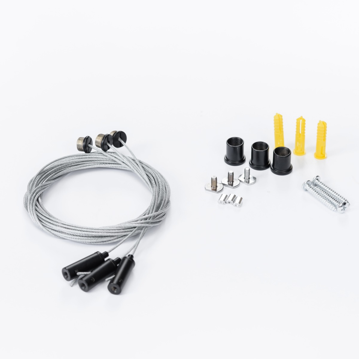 Тип установки: подвесной. В комплект входят регулируемые тросы длиной по 2,5 м и крепления. Это обеспечивает надёжную фиксацию и гибкость при монтаже на различных высотах.