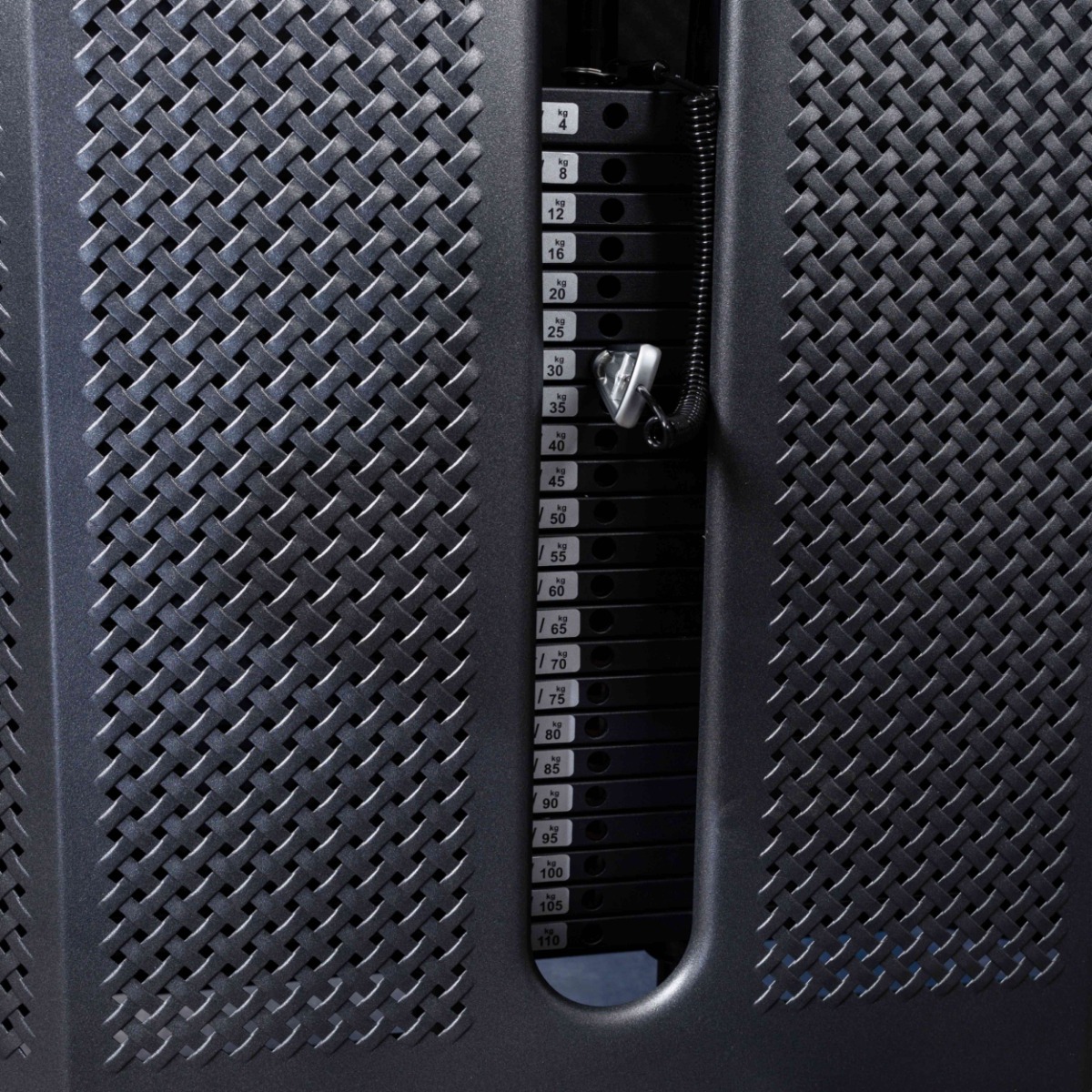 Металлическая перфорированная защита весового стека с лицевой стороны и сплошная защита с задней стороны выполнена из листового металла толщиной 2 мм. Ребра жесткости у основания, примыкающие к несущей раме через скрытое болтовое соединение сечением 6 мм в восьми точках, повышают эксплуатационные параметры тренажера.